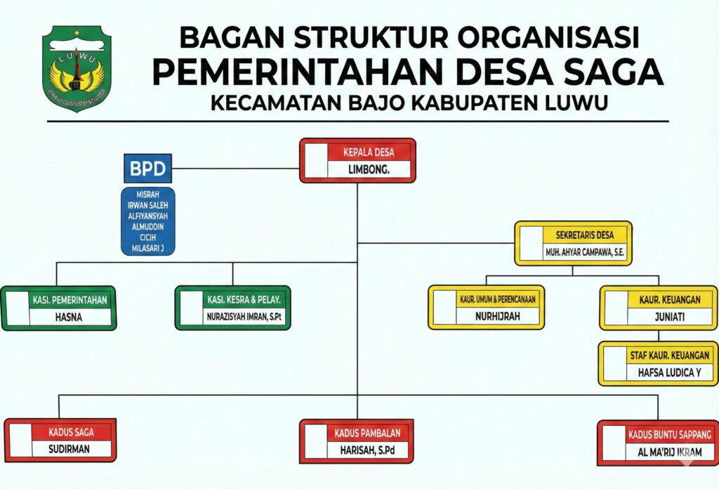 Desa Saga adalah salah satu desa yang termasuk dalam wilayah Kecamatan Bajo. Luas wilayah Desa Saga adalah 3,29 km2. Persentase luas wilayahnya terhadap luas wilayah Kecamatan Bajo sebesar 4,14%. Lokasi Desa Saga berjarak 3 km dari ibu kota Kecamatan Bajo. Sedangkan jaraknya dari ibu kota Kabupaten Luwu ialah 14 km.